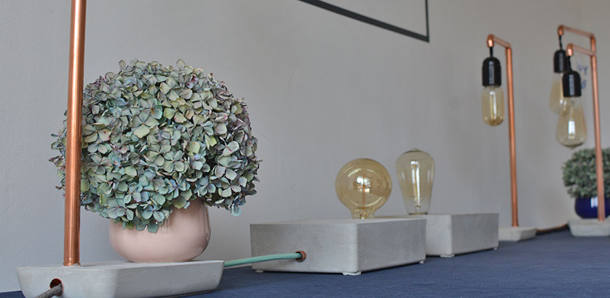 – Le modèle « Victoire » C’est un gros bloc de béton, une ampoule vintage à filament et un câble torsadé pour une touche de féminité. Dépouillé et très efficace.
